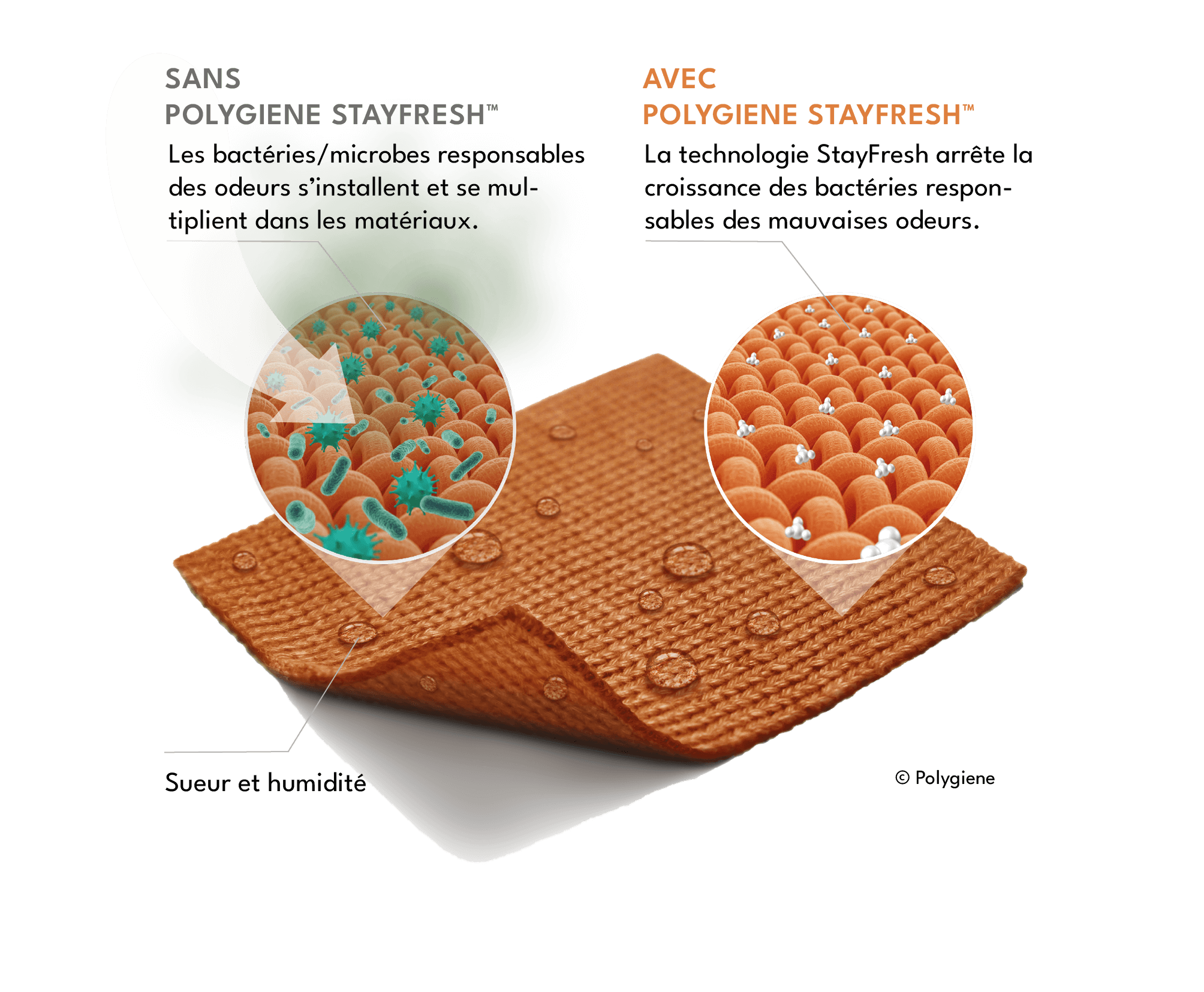 Polygiene StayFresh inhibe la croissance des bactéries responsables des odeurs, arrêtant ainsi les odeurs à la source.